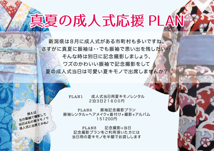 なので前撮りしましょう、当日は振袖着れなくても20歳の記念に写真は撮りましょう!というご提案です。そして成人式当日はワズの夏キモノのレンタルもオススメですよというご提案。