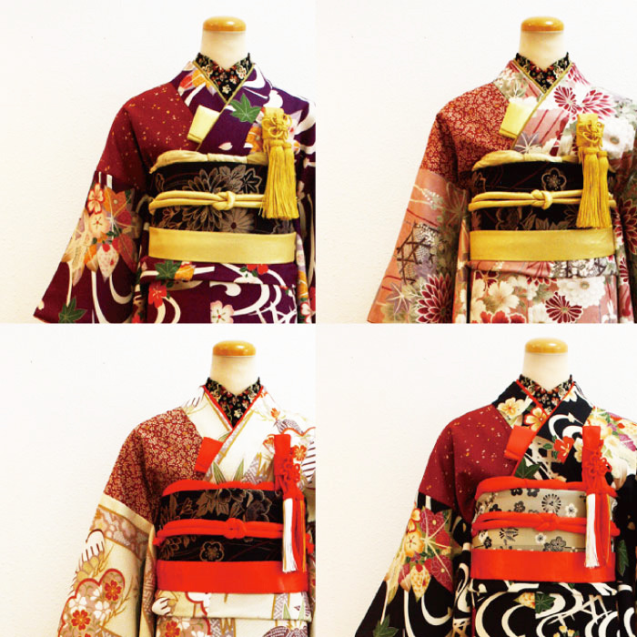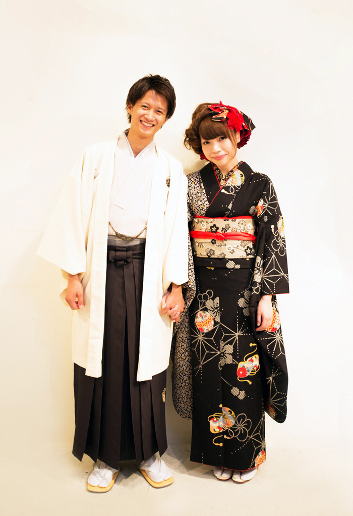 通常この振袖に花嫁小物を付けたセットと新郎様のキモノセットを挙式披露宴用に7泊レンタルすると162000円になりますが、このプランですと更に2人分の着付けとスタジオ撮影と撮影データ入りCD-ROM(約20カット)がついて108000円になります。