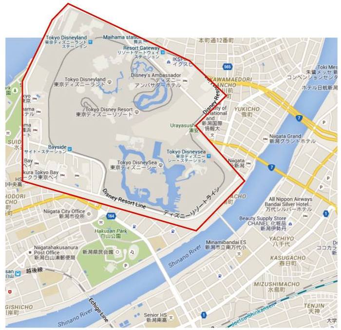 古町を楽しい街にしたい!個人的にはもっとマニアが集まる街でいいと思うし、ディープなワンダーランドになればいいと思ってます。ちなみに某夢の国を古町に持ってくるとこうなります、こんなに広いのか夢の国は!!!古町どころか日本海まで突き出た!!