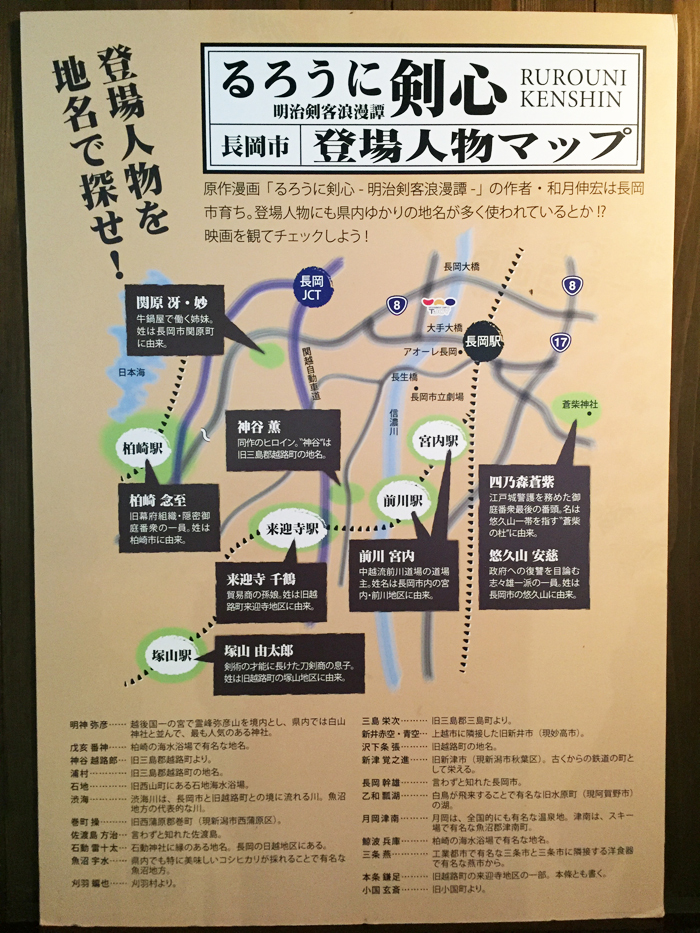 このパネルにありますが、るろうにに出てくる人物名には新潟県内(主に長岡中心)の地名が多く使われています。代表的なので言うと、明神弥彦 三条燕 長岡幹雄 巻町操 月岡津南 小国玄斎 柏崎念至 悠久山安慈 来迎寺千鶴 新津覚之進 佐渡島方治 魚沼宇水 刈羽蝙也 鯨波兵庫 乙和瓢湖あたりがわかりやすいですが、サブキャラとかでも凄くマニアな地名とかも出てきます 笑