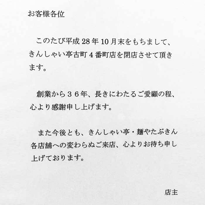 で、36年ですって!古町4番町で36年ですって!これ凄い事ですよ、飲食店で一つの場所で36年やる続けるって半端無いですよ、それだけ飲んだ後のおっさん達に愛されていたんです。「締めはきんしゃいだよな!」が合い言葉のようでしたから 笑