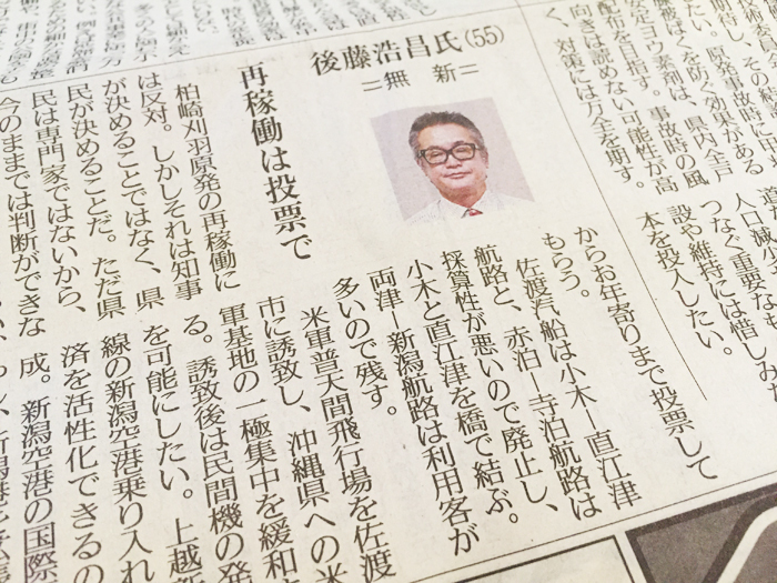 今日の新潟日報朝刊で新潟県知事選の立候補者の特集が組まれており、やはり有力である、森氏と米山氏両名の記事が大半で三村氏と後藤氏は小さい・・・が、この後藤という立候補者、初めて公約的なのを読んだが・・おもろい 笑