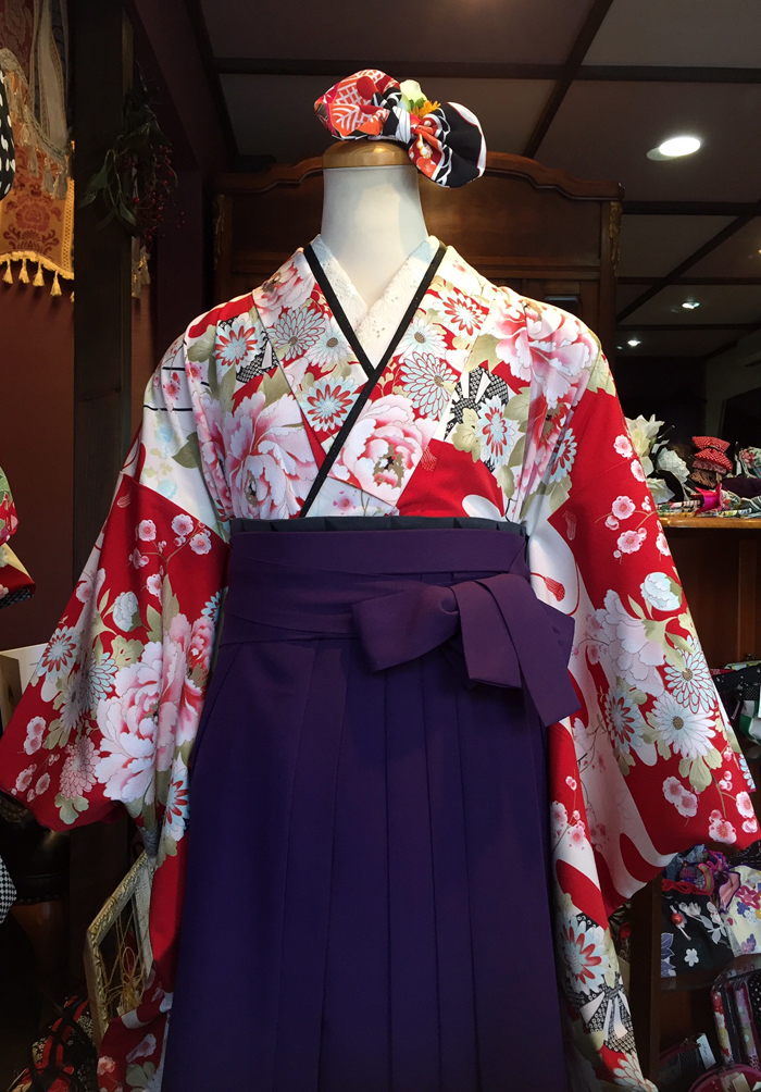 天気がいいので入り口オープンで気持ちよく仕事しております、今日も開店直後からいろいろなお客様がいらっしゃって現在14時、ちょっとのんびりしたのでハカマのボディーを着せ変えました、赤地に白い流水柄と牡丹のワズの中では正当派な部類のキモノにハカマを合わせました。