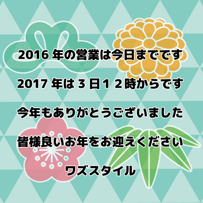 本日、29日で2016年のワズスタイルの営業を終了させていただきます、今年も沢山の方にワズスタイルをご利用いただいた事を感謝致します、ありがとうございました。