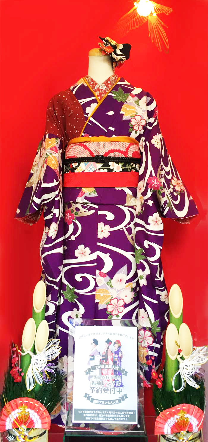 ショーウインドウを正月っぽくと思いまして、赤い毛氈を背景にしてみました、今日から大晦日もお正月もずーっとシャッターは閉めずに照明をつけておきます、沢山の方が見てくれると思いますので、ちょっとインパクトのあるムラサキのオリジナル振袖を着せました、うん、いい感じ。