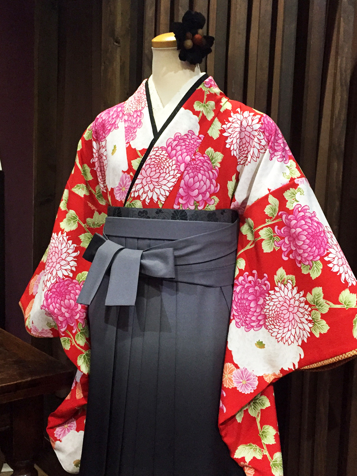 さて、朝の日課でボディーの着せ替え、今日もハカマスタイル!!毎回しつこく書きますが「3月の卒業式のハカマセットレンタルはまだ間に合います!」です、今日のコーディネートは赤と黒でビシッと!!この組み合わせももちろんまだ3月にレンタル可能です。