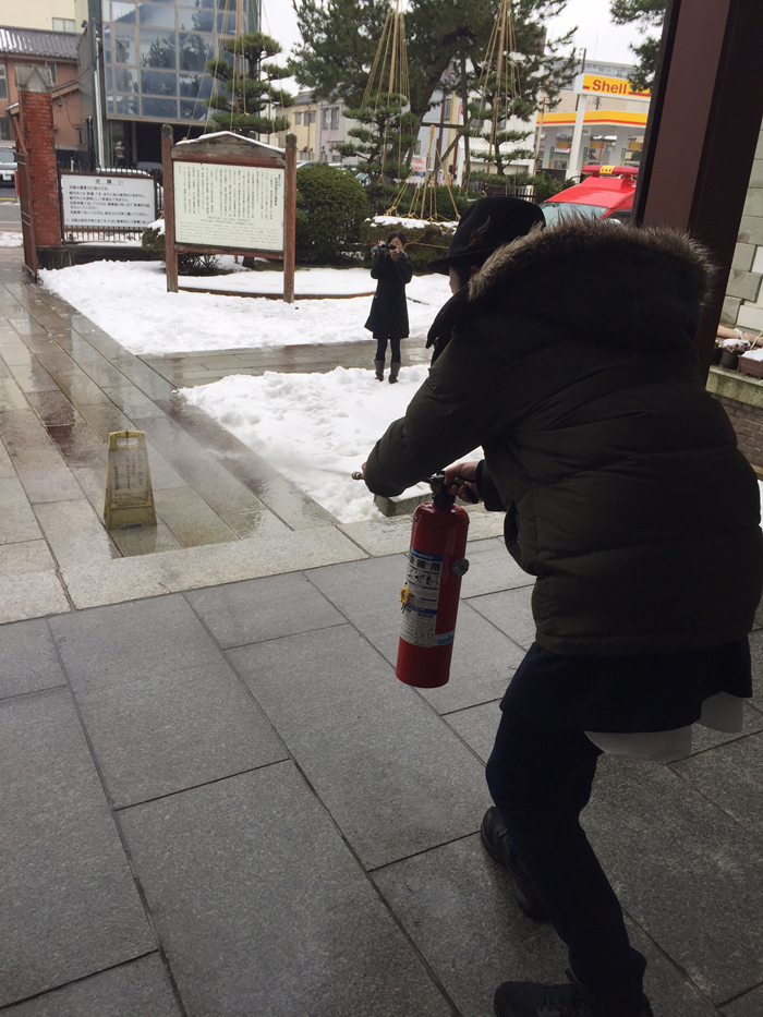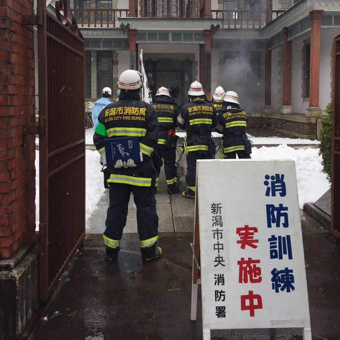 火災の多い季節です、そんな中、今日はワズの開店前に新潟県政記念館の防災訓練がありまして、参加してきました(県政記念館は上古町が指定管理者として関わっておりまして、ボクが担当しております)雪の降る中、議場が火元で火災発生という想定で訓練開始、ボクは一般客って事で2階から避難する役割。