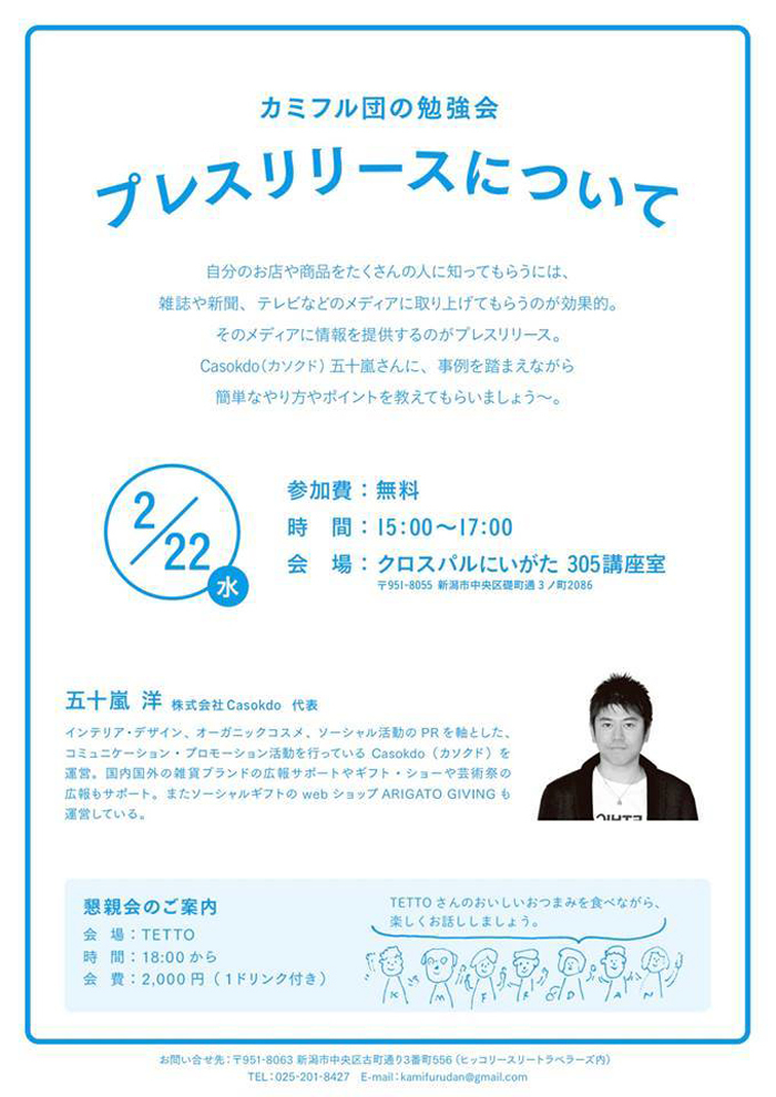 カミフル団より、上古町商店街や周辺の方を中心にお知らせです!ヒッコリーがいつもお世話になっているCasokdo五十嵐様を講師にお招きし、プレスリリースについての勉強会を開催いたします。参加費は無料ですが、カミフル団の活動にご賛同いただける方は、寄付をいただけると幸いです。
