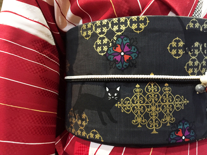 赤白の矢がすり柄のポリエステルのユカタですが、長襦袢を重ねれば単衣の夏キモノとしてもお使いいただけます、このような伝統柄や幾何学模様っぽいキモノには今回の柄の半巾帯がとても合います、この帯・・よく見ると黒ネコちゃん。