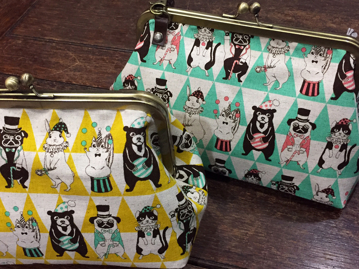 現在ワズスタイルで半巾帯とバッグ展を開催中の鴉屋さんがうちのために特別に作ってくれた超レア限定品です、横巾が約23センチでマチも13センチくらいあります。がま口が大きく開くので物も入れやすいのです、というか、凄く可愛い!!(パグ馬鹿発言)