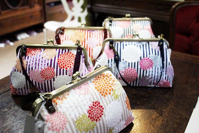 今日はこの前来たときに「こんなのがあったらいいなー」ってとこから出来上がったキモノでも洋服でも使えるタイプのバッグ、七五三の女の子が持ってもすごく可愛いです。5色完成!!
