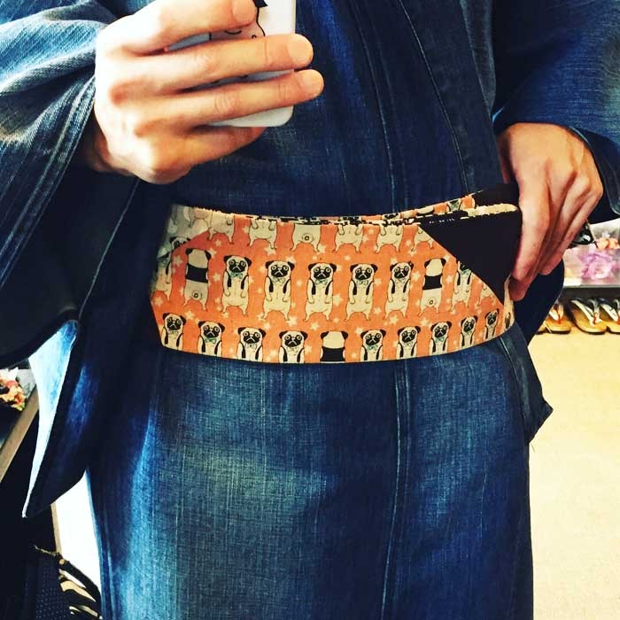 全国のキモノ屋さんでも「デニムキモノにパグの帯」は僕だけだろうなー 笑