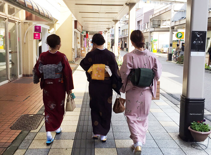11時に来て、キモノ選んで3人着付けしても12時前には変身完了です。キモノを選ぶのは当日でもいいですが、事前に選んでおけばもっと早いですし、着付け自体は一人15分程度です。
