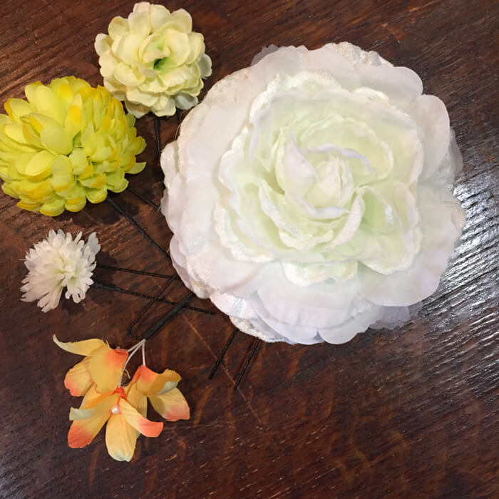 メインの飾りと小さな飾りのセット、バランスを見ながらつけられるのでオススメなのです。セットで3780円(税込)とお買い求めいただきやすい価格になっております。メインの花が赤のセットもありますよ。