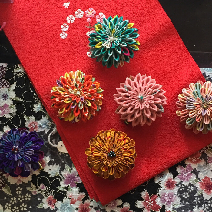 成人式の髪飾りですとやはり大きめなタイプが人気ですが、小さくても存在感のあるこのようなつまみ細工の飾りもオススメなのです、直径は6センチ弱くらいですが、細部にまでこだわった飾りは素晴らしいです。