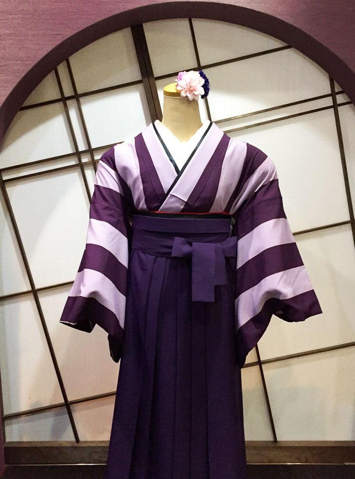 で、お客様が変えられてから今回は縞のキモノに袴にしてみましたよ、どうしてもキモノって「花柄」が多くなりますのでこのようなシンプルなストライプなどは逆に目立つんです、人気なのです。