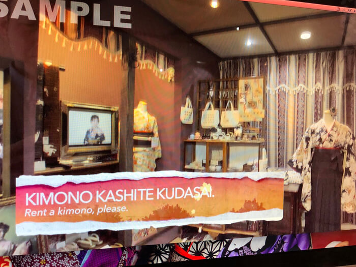 ワズにはカップルモデルさんが来てくれてカジュアルキモノのレンタルをして町歩きをするという流れで・・・ワズの店内が写り、そこにテロップで「KIMONO KASHITEKUDASAI」と書いてありました 笑