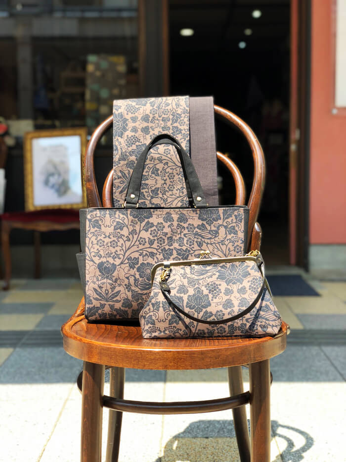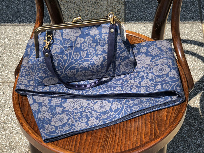 半幅帯は綿素材で長さもたっぷりありますのでアレンジしやすく使いやすいですよ、9720円(税込)となります、手前のがま口バッグは8100円(税込)奥のスクエアタイプは10260円、キモノにはもちろんですが洋服の時にでも使いやすいです。