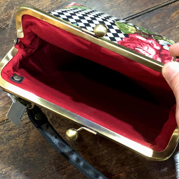 使いやすいと思いますよ、持ち手を含まないと高さと幅は23cmくらいでマチが7cmくらいです、がま口がガバッと開くタイプです、お値段は6480円(税込)となります、鴉屋の商品は基本的に現品限りですので「これいい!」とピンと来たらぜひ!!