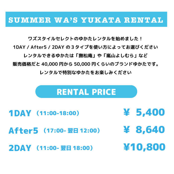 先日も書きましたが、今年は基本的にゆかたの販売はしません、新作の仕入れもしていません、そのかわりに、本気でゆかたレンタルを始めます。それもかなり良いゆかたをレンタルできるのです、撫松庵や嵐山よしむらなどのキモノの人気ブランドの中でもワズがセレクトしたゆかたばかりです。