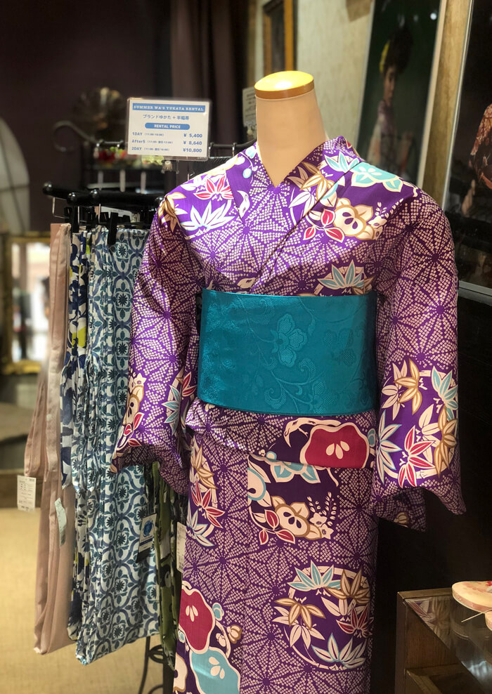 今日からどんなゆかたがレンタルできるかを写真でアップしていきますので参考にしてください。今日の一枚は紫のこれです、レンタルゆかたは全てポリエステル素材ですのでさらっとしていて着やすいですよ。