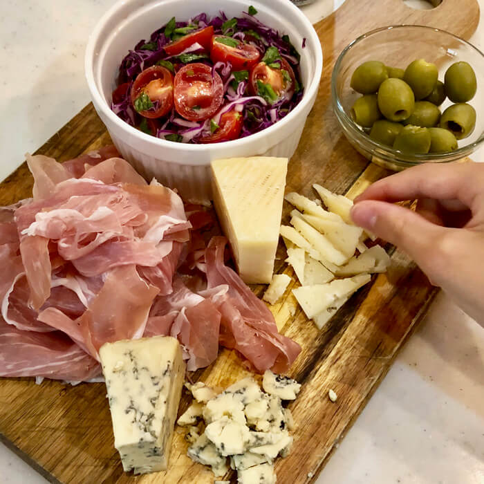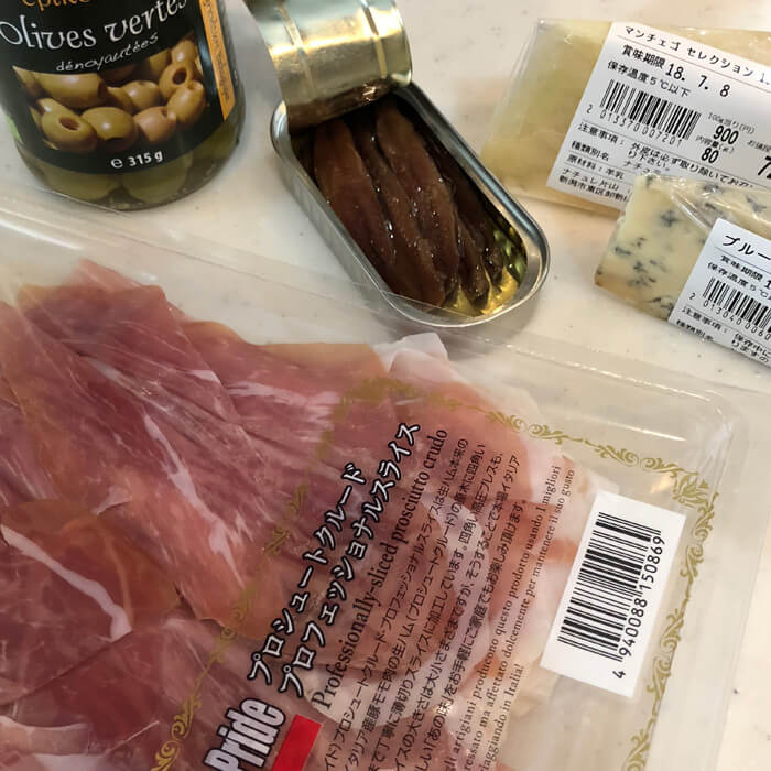 盛り付けてこんな感じで、昨日の夕飯はワインバーっぽく(コンビニワインだけど)