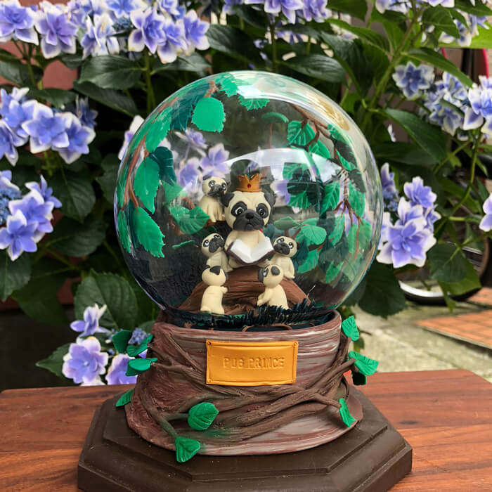 ワズでは、皆川良一さんのパグ展も開催中、こんなガラスのドームに入ったパグたちも・・