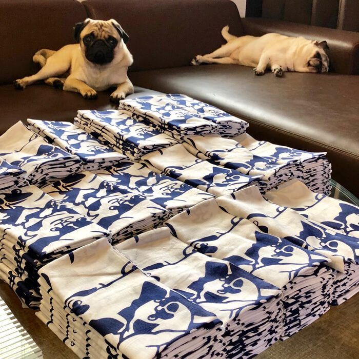 しかし、うちのオリジナルパグ手ぬぐいがそんな大事な日を前に品切れしていまして、お問い合わせも多数もらってたのですが、染めは間に合わないだろうと諦めていましたら、染め工場から「できました!」との連絡が!まじですか!
