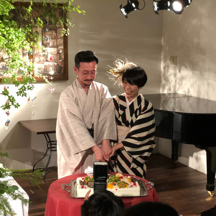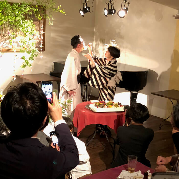 恒例のケーキカットからのファーストバイト、やるよねー。