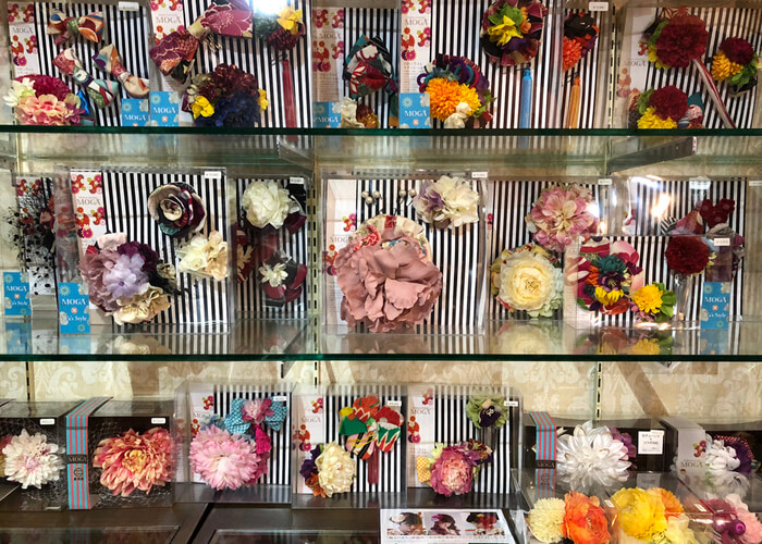 さてさて、昨日店内の飾り変えをしまして、壁面の棚も髪飾りだらけ!