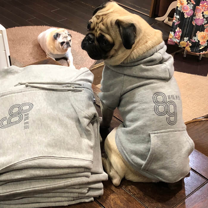 ワズの別展開であるパグスタイルの方は相変わらず好調でして、パグデザインのパーカーもサイズによっては品切れだったのが昨日完成して現在は全サイズ豊富です、そしてこの写真でわかるように・・・ついに犬用のパーカーまで作ってしまった!!笑