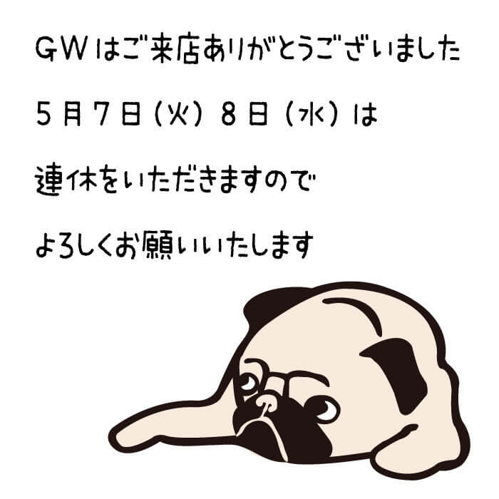 さあ、GW最終日です、10連休だった方は明日からお仕事頑張ってください、ワズスタイルは連休中営業でしたので明日明後日は連休をいただきます、お間違えのないようにお願いいたします。