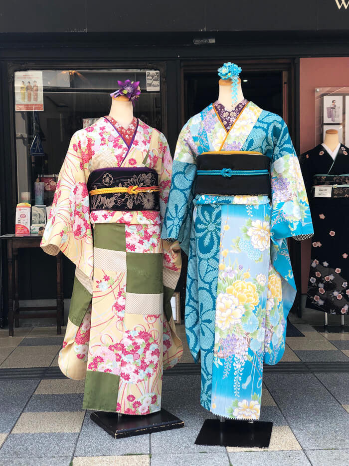 今日はこんな可愛い振袖が外から見えるショーウインドウと店内に飾ってあります。