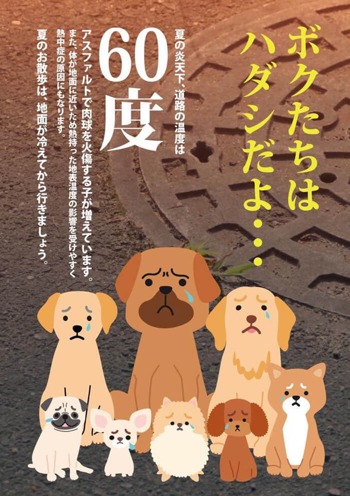 散歩の時は必ず道路を触ってみてください、犬はそこを裸足で歩くのです、夏に海水浴に行った時に砂浜を素足で歩くのを思い出してくれればいいと思います。しかも犬は人間の膝下くらいの場所に胴体が全部あるわけです、ボク達の体感気温とは違うのです、それをわかってほしいのです。